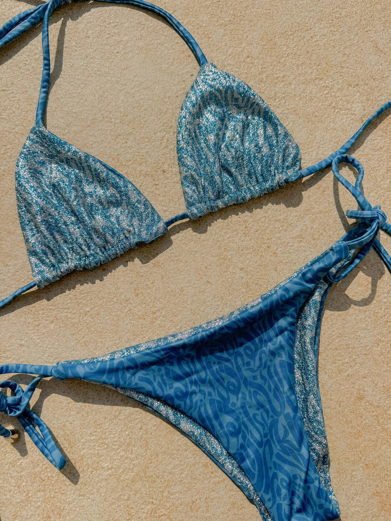 Each bespoke piece is fully customisable, unique and ethically handmade to order in our Dubai studio. The staple calligraphy print is Arabic and English spellings of KIMKINI and all our custom swimwear material is made from recycled ocean waste.