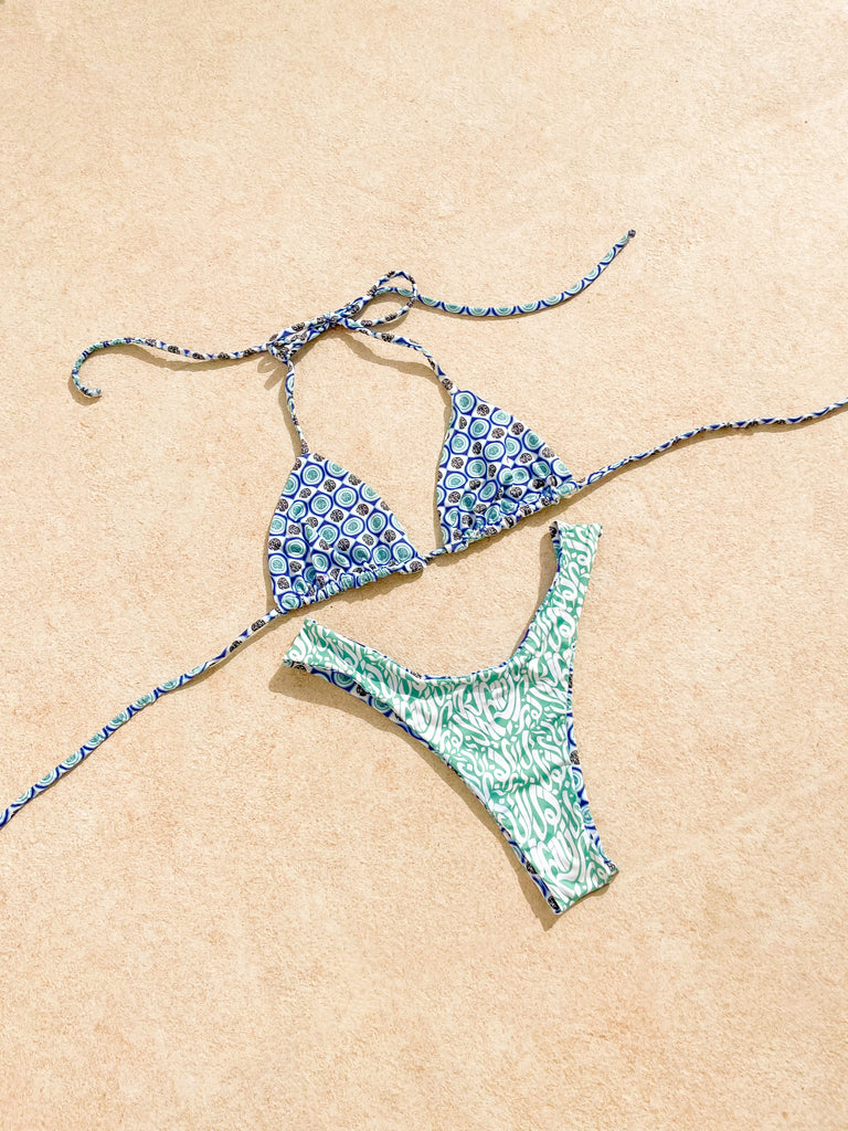 The material used is RecoTex fabric which is created from recycled ocean waste such as discarded fish nets and plastic bottles. ♻️ Also, the bikini is reversible which means you can turn your swimsuit inside out - TWO bikinis for the price of ONE!