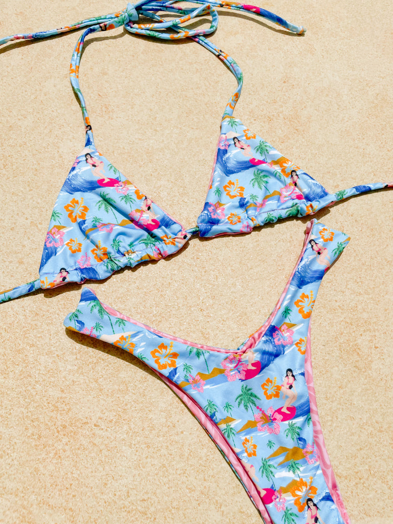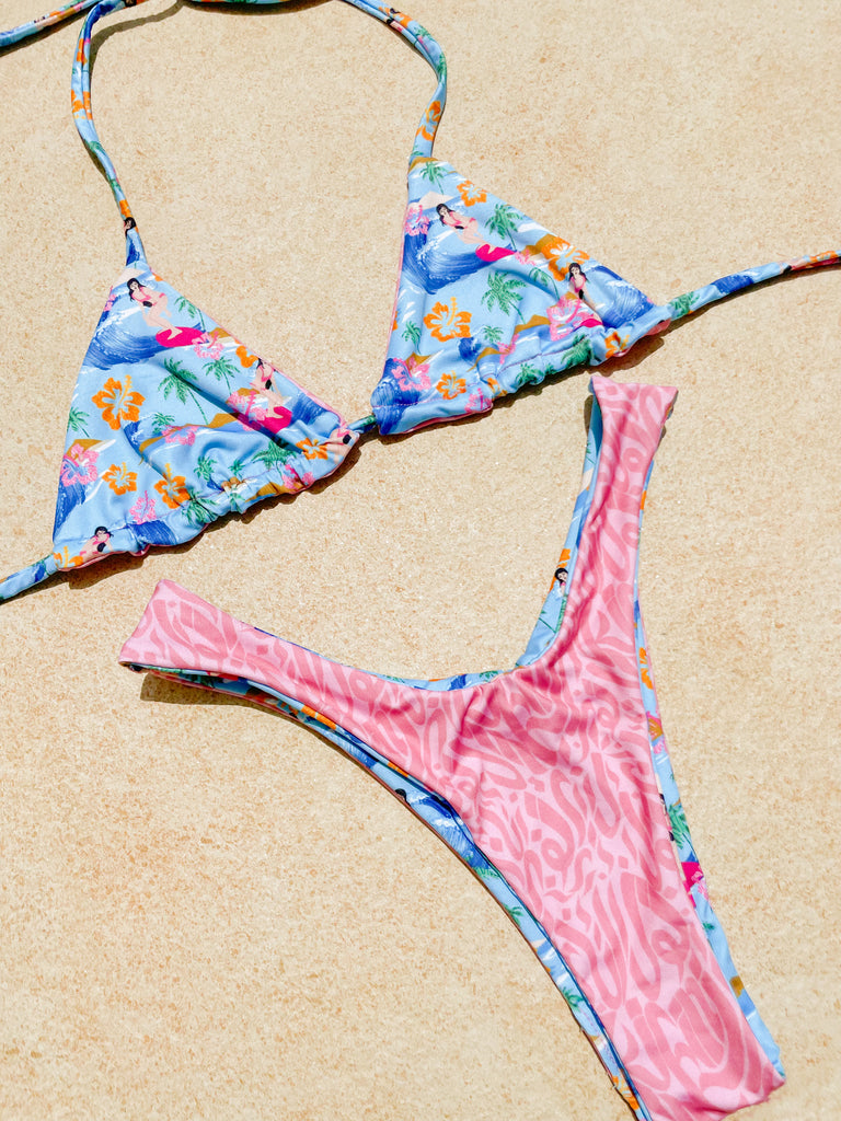 The material used is RecoTex fabric which is created from recycled ocean waste such as discarded fish nets and plastic bottles. ♻️ Also, the bikini is reversible which means you can turn your swimsuit inside out - TWO bikinis for the price of ONE!