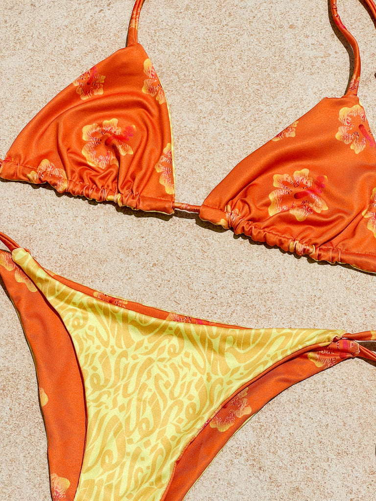 The material used is RecoTex fabric which is created from recycled ocean waste such as discarded fish nets and plastic bottles. ♻️ Also, the bikini is reversible which means you can turn your swimsuit inside out - TWO bikinis for the price of ONE!