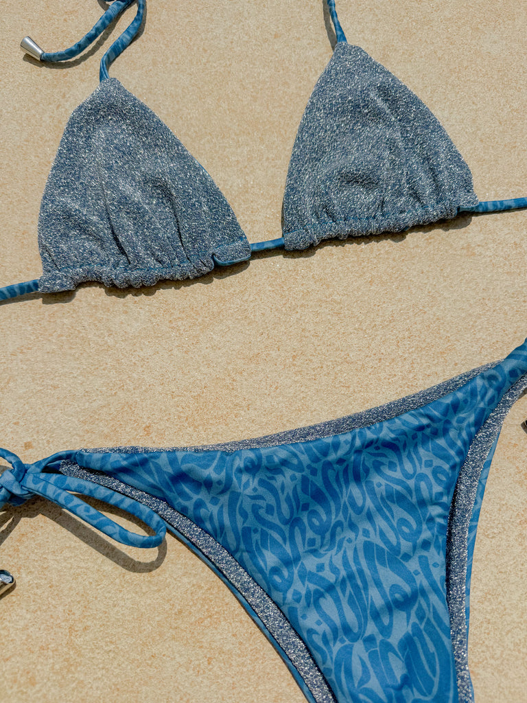 The lining of the bikinis have an eco-friendly RecoTex fabric with our custom and staple calligraphy design printed on it. It’s a mixture of Arabic and English spellings of our brand name KIMKINI.