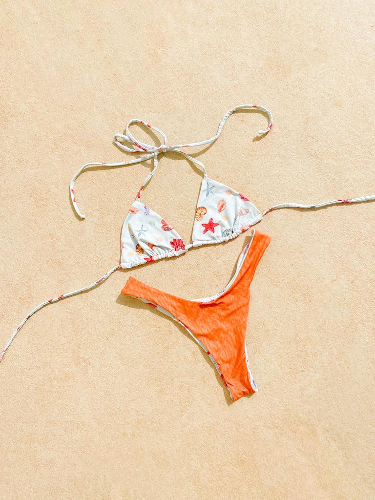The material used is RecoTex fabric which is created from recycled ocean waste such as discarded fish nets and plastic bottles. ♻️ Also, the bikini is reversible which means you can turn your swimsuit inside out - TWO bikinis for the price of ONE!