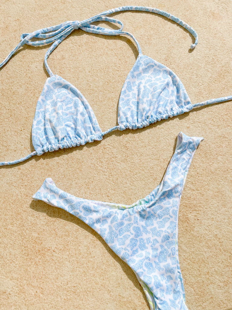 The material used is RecoTex fabric which is created from recycled ocean waste such as discarded fish nets and plastic bottles. ♻️ Also, the bikini is reversible which means you can turn your swimsuit inside out - TWO bikinis for the price of ONE!